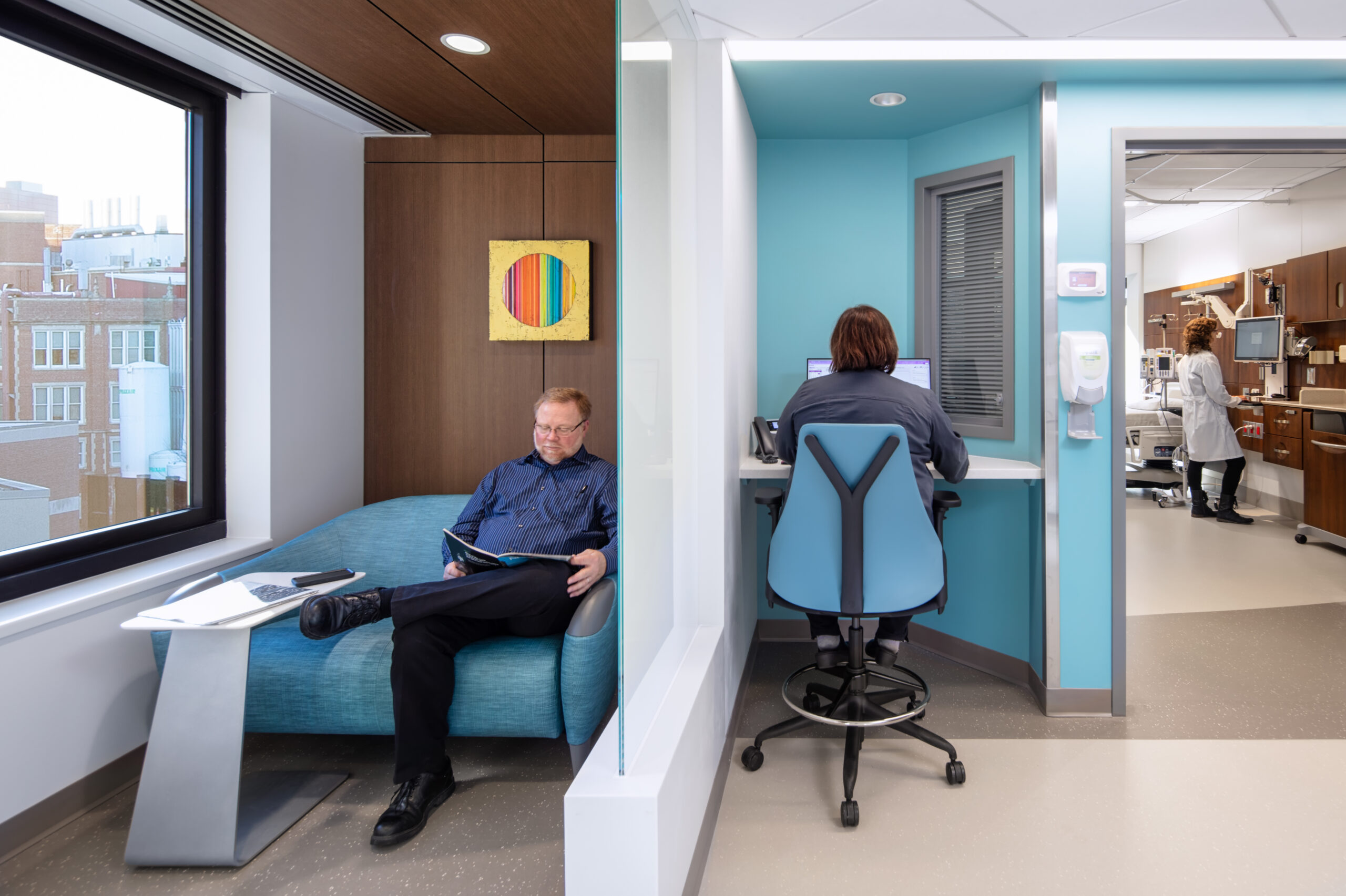Studio 483 teamed with CannonDesign on the collaborative design for the renovation of two inpatient units in the hospital pavilion towers of University of Iowa Health Care. The 19-bed Respiratory Specialty and Comprehensive Care Unit (RSCCU) and five-bed palliative care unit is a 23,400-square-foot design arranged to allow the two departments to flex into each other’s space at times of high census. Design and construction documents were completed for this project, and construction is anticipated in the future. The Adult Leukemia and Blood & Marrow Transplant Unit (ALBMT) collocates two inpatient units into one cohesive 22,600-square-foot unit of 24 private inpatient beds. Construction of this floor was completed in 2018.