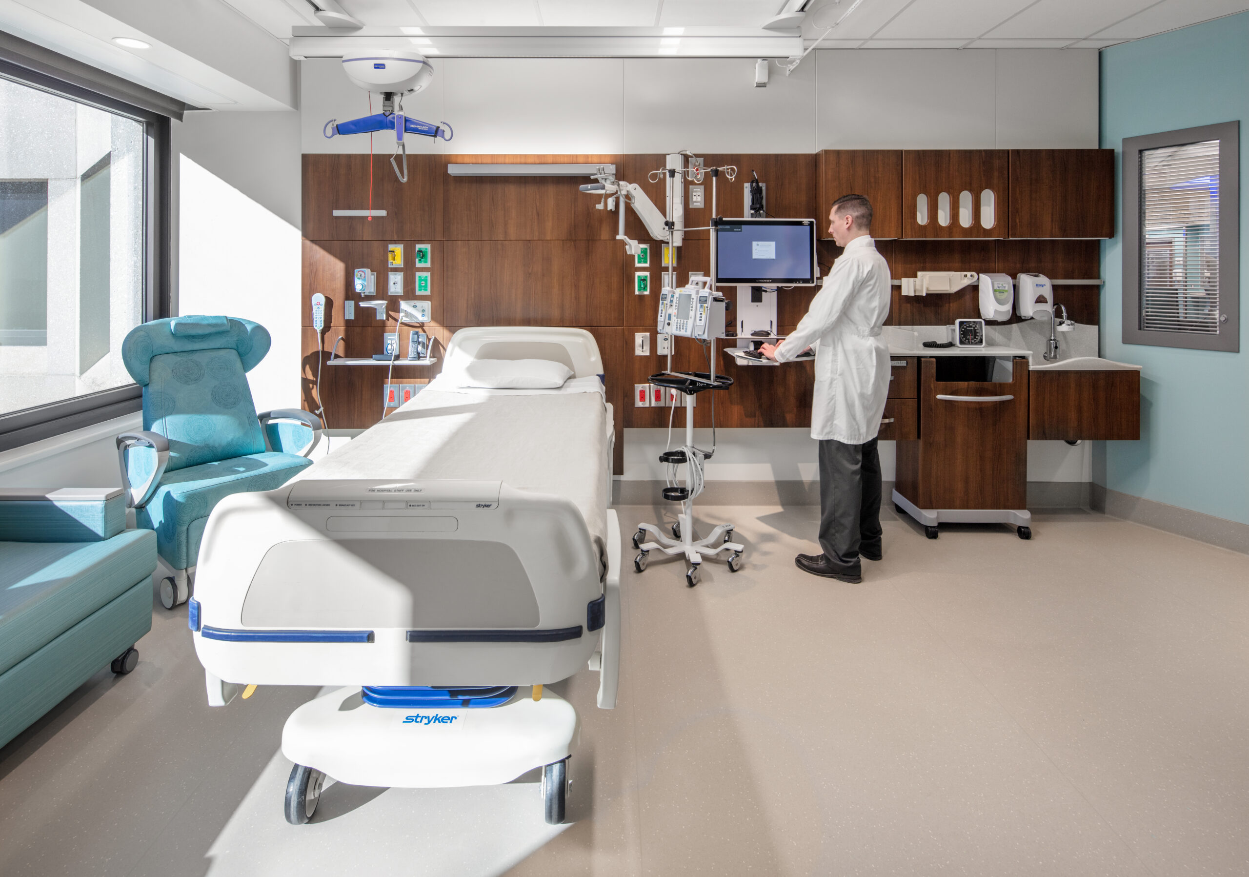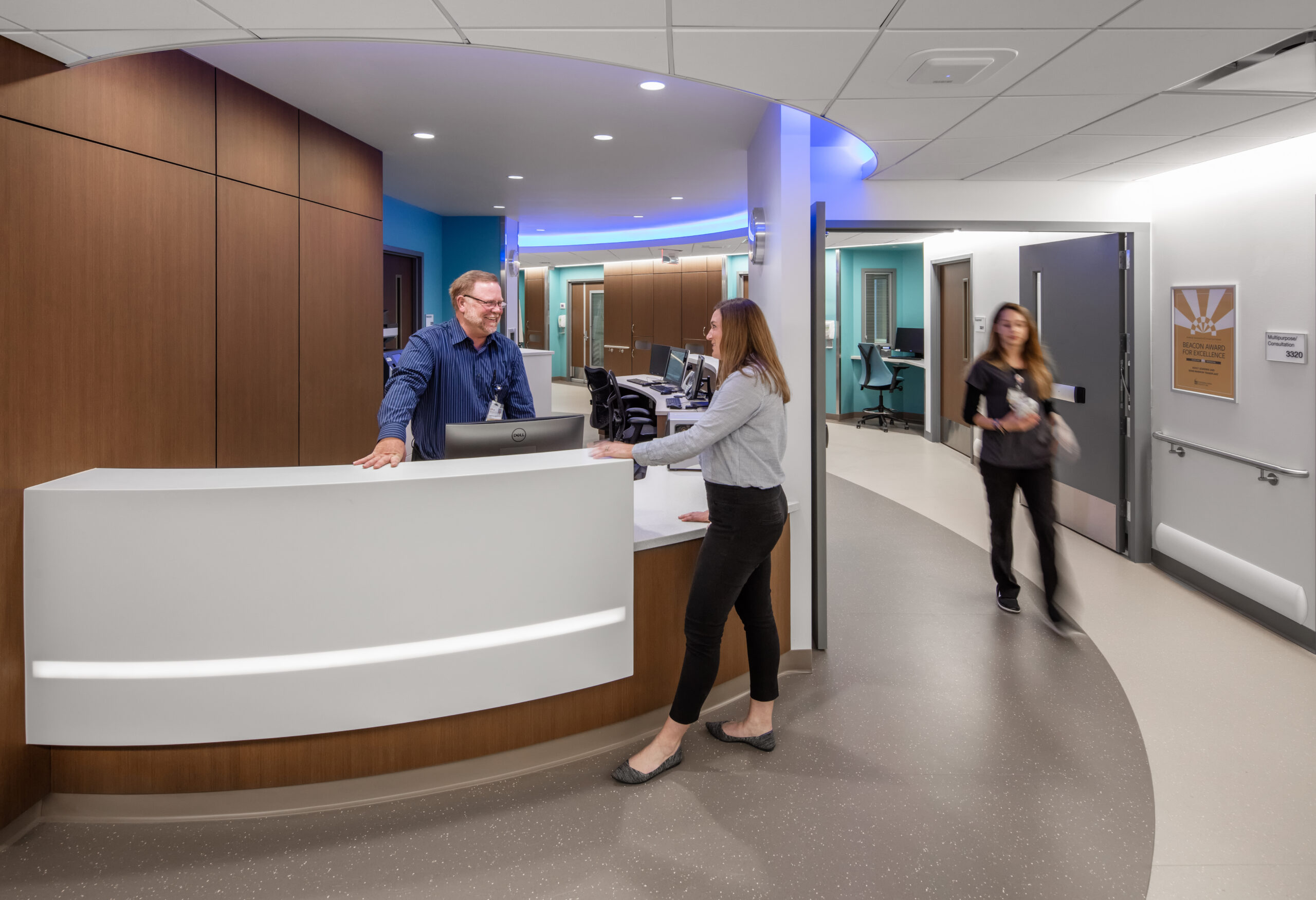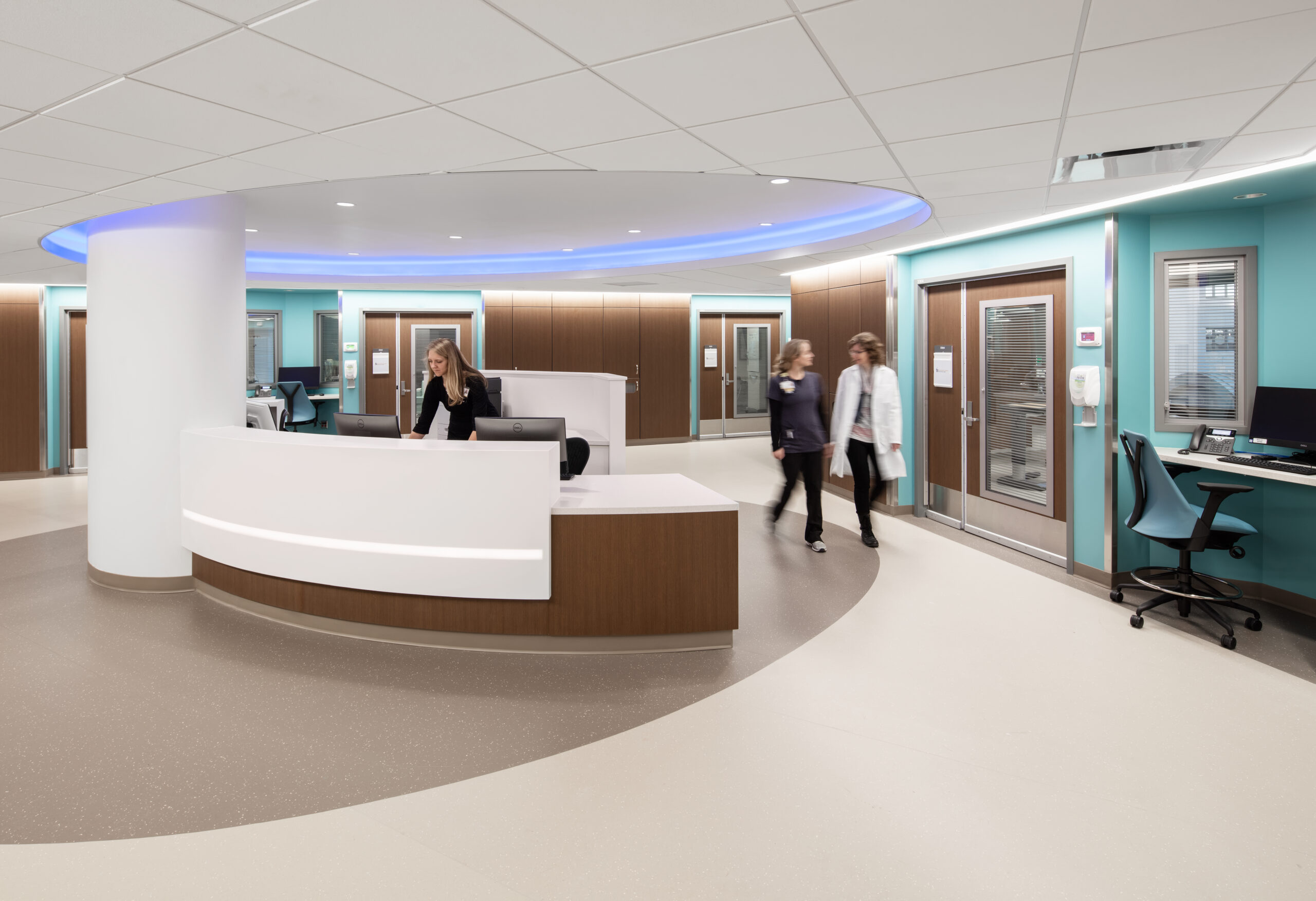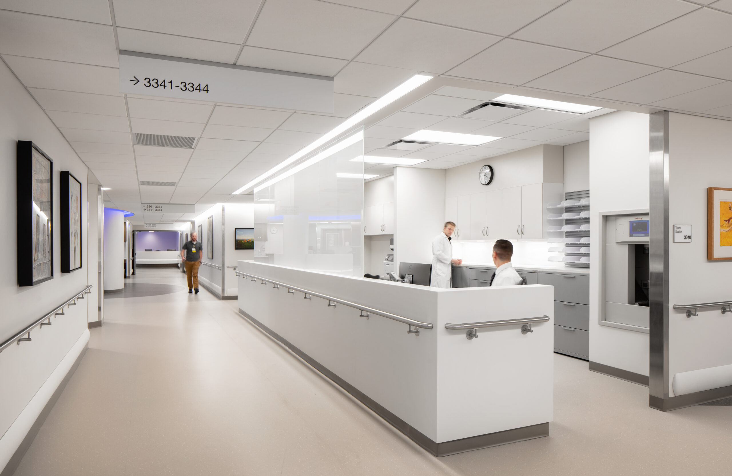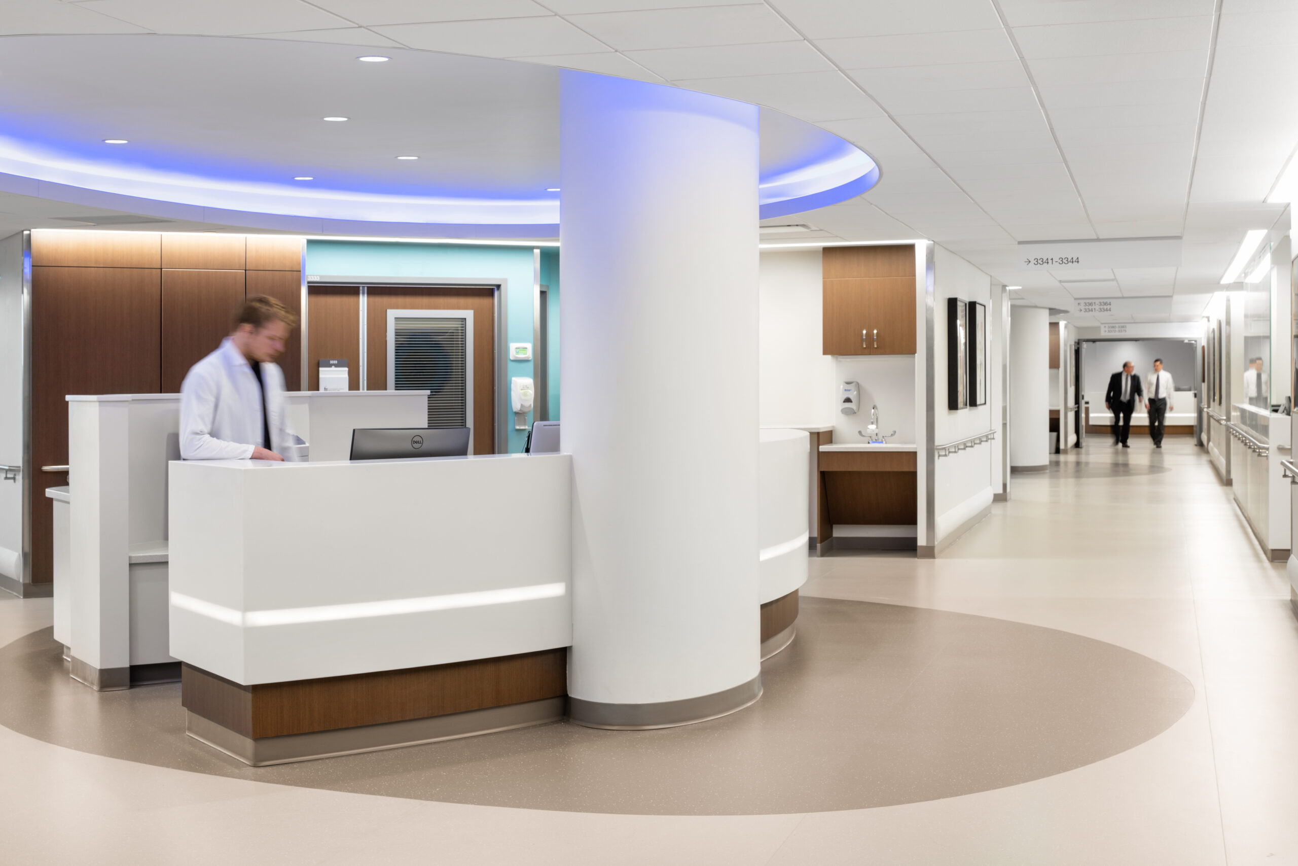 The design of the two hospital pavilion floors is intended to set the standard for future renovation and has several consistent features. Unit design arranges the patient rooms to allow circulation space to reach the exterior windows, which in turn provides a pathway for natural light to reach further into the core of the floor plate. The floor plan utilizes a larger team station in the center of the plan as well as smaller nurse stations adjacent to the patient room pods, with multiple family support space options.