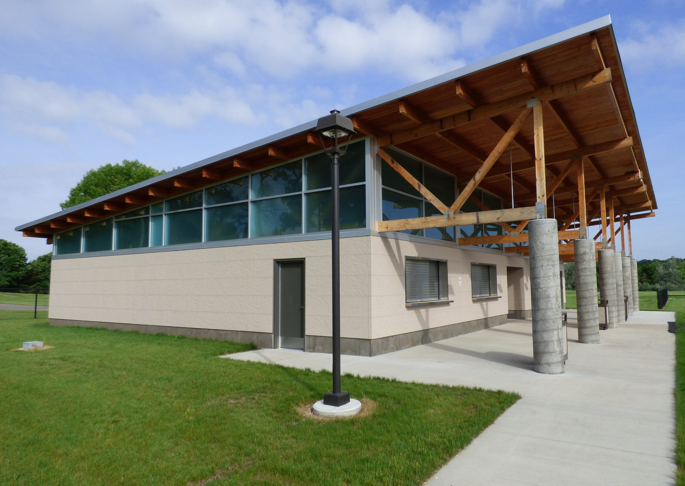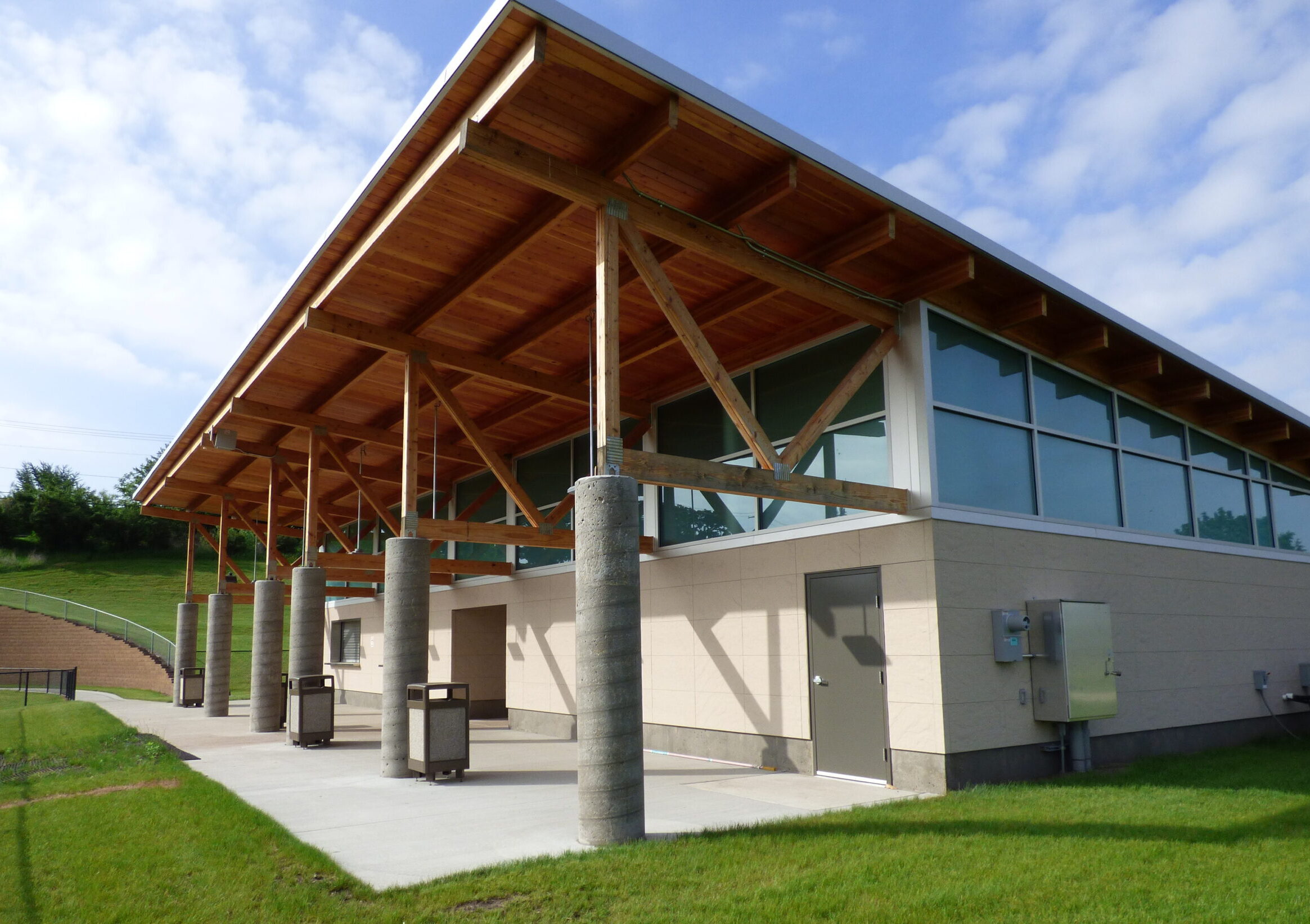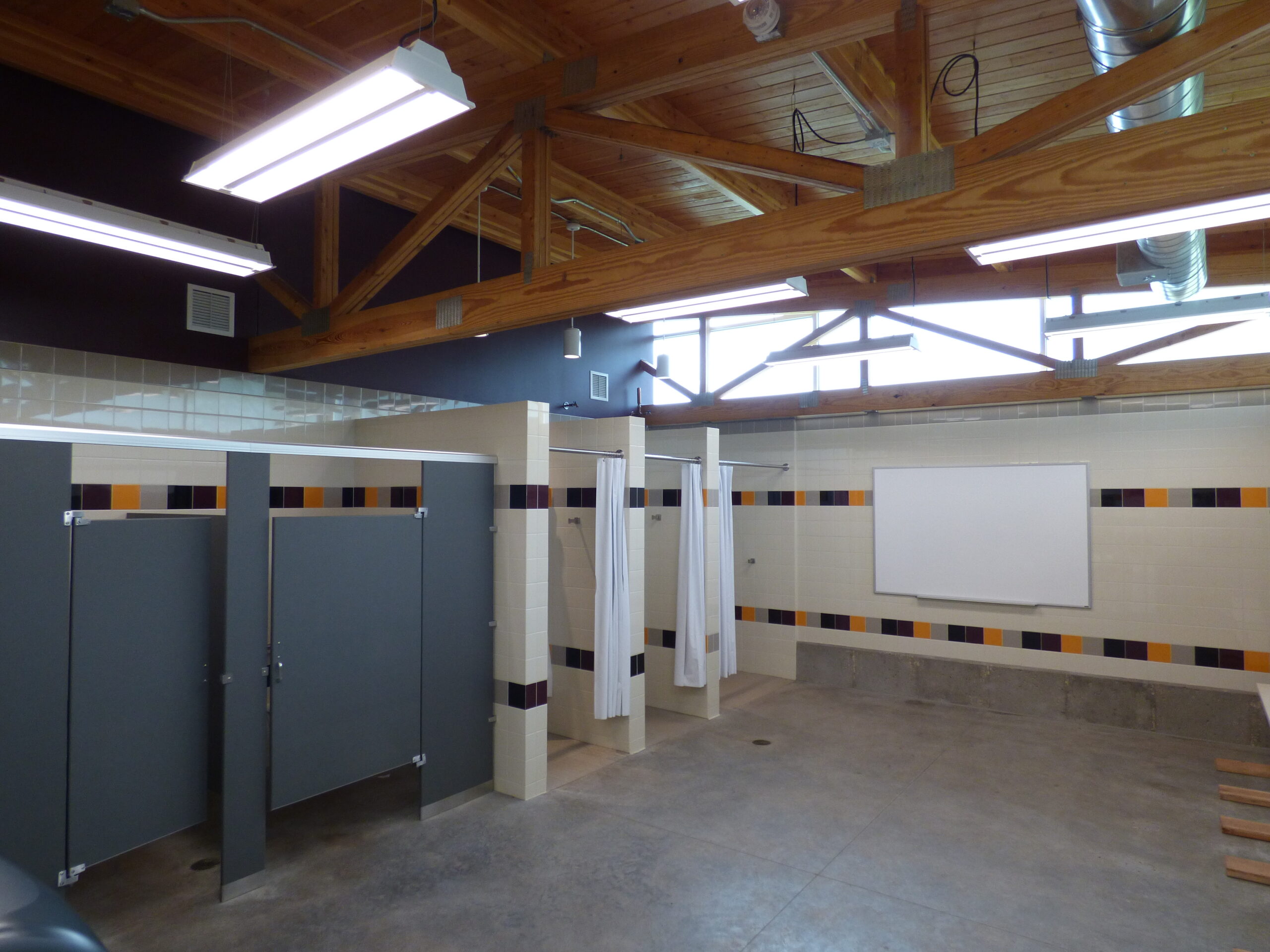The new athletics locker room facility for Ashford University in Clinton, Iowa, is adjacent to the athletic field and includes locker rooms, restrooms, concessions, and a training room. The location on the west side of the field places the facility close to the bleachers and is positioned for future facility expansion options.