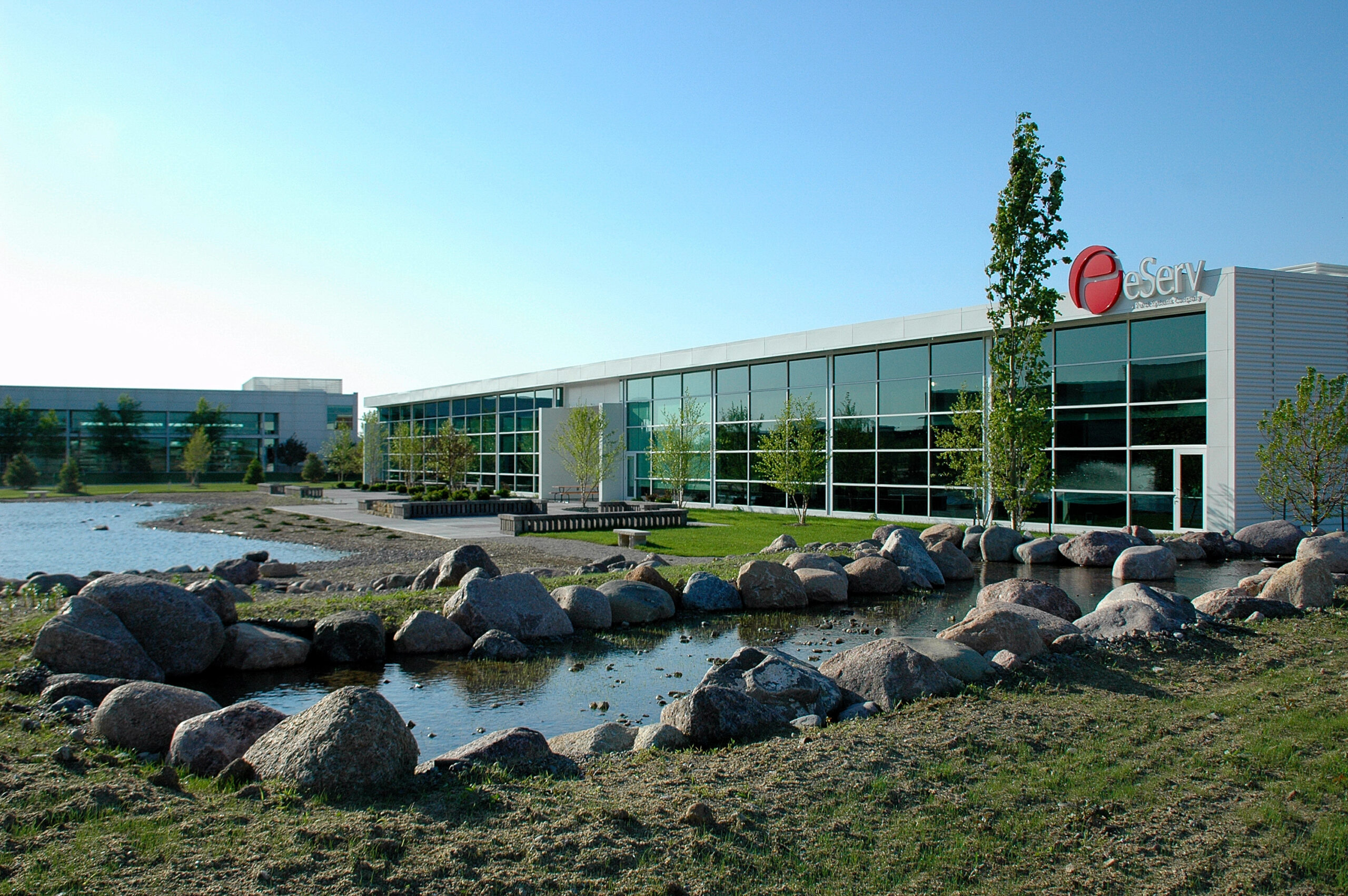 The building was designed to provide open office space for eServ’s private industrial clients and a more secure environment for its federal government contracts. In addition, there is a central employee lounge with full-service kitchen adjacent to flexible training rooms, opening to an outdoor plaza.