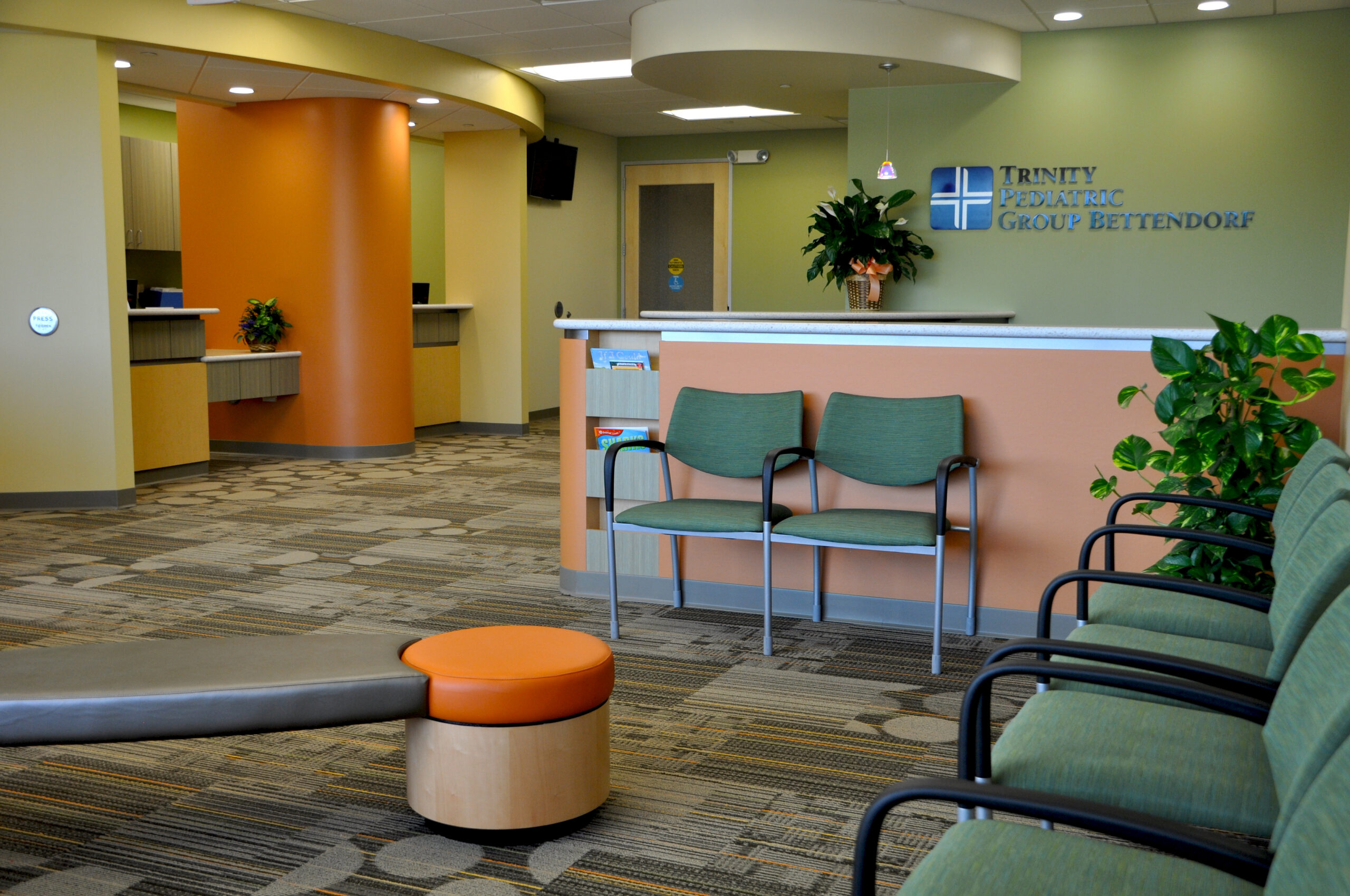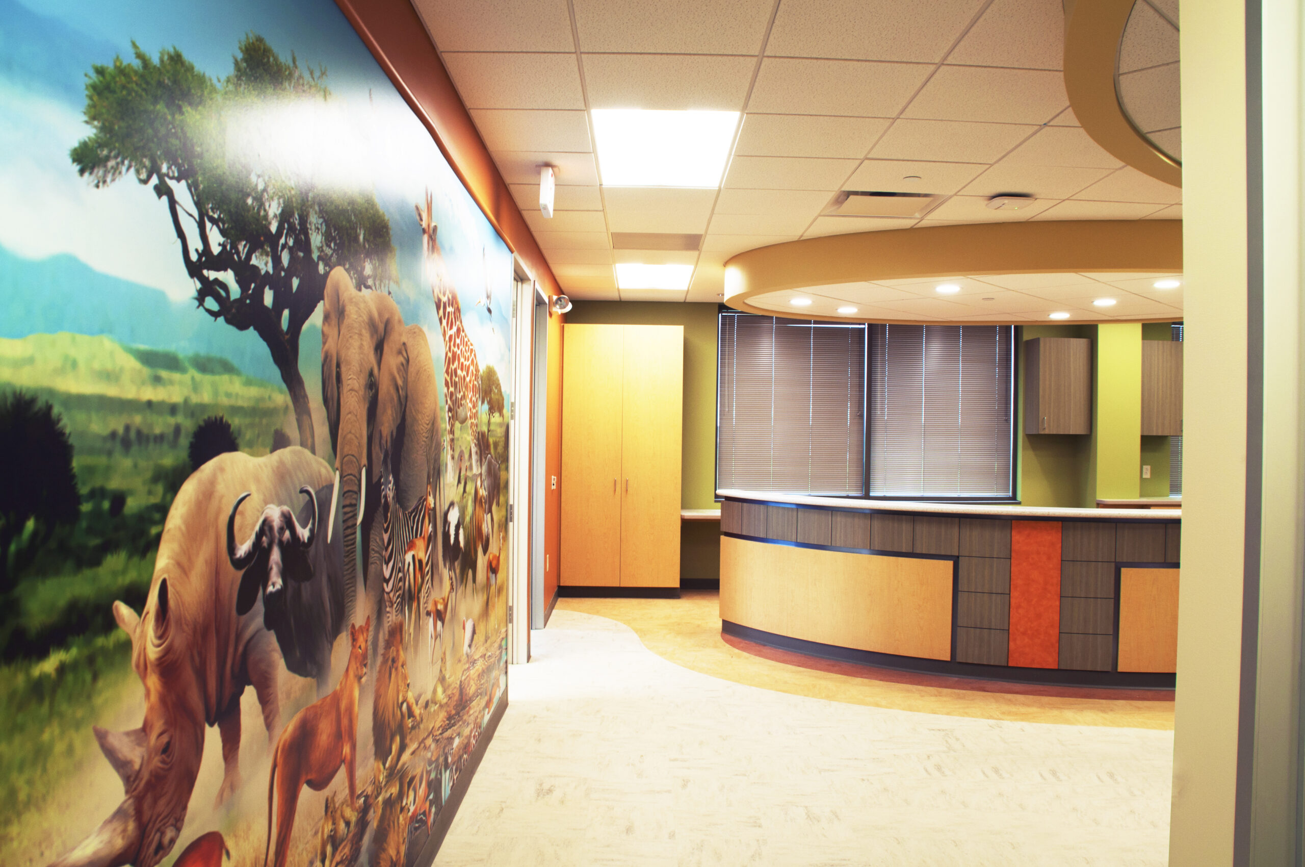 The new UnityPoint Pediatric Group is a two-physician clinic designed to be family and child friendly with a sense of whimsy. The bold curved ceiling shapes and accent walls engage the imagination of children while providing wayfinding to areas of family and patient interaction. Secondary paint colors are utilized to provide accents on key walls, and the maple wood finishes, subtle patterned carpet, and natural linoleum flooring accentuates the playful theme. Daylighting is a key component, and the skewed oval nurse station is located at the exterior wall to let natural light into the circulation core. Large animal murals are incorporated in the corridor as well as each exam room with “jungle”, “river’ and “sea” themes, coordinating with the interior color palette and positioned to encourage interaction with the family and ease the tension of a child’s doctor visit.